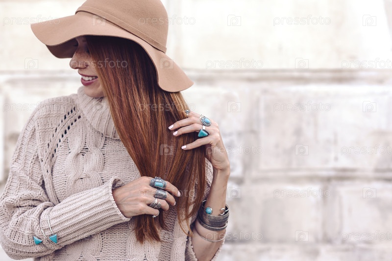 Модель в осеннем уютном свитере и ювелирных украшениях бохо