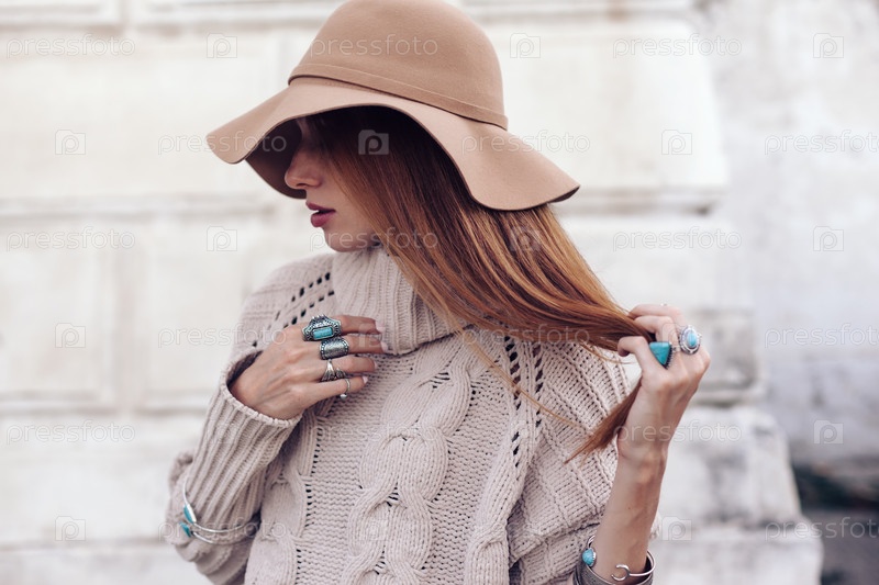 Модель в осеннем уютном свитере и ювелирных украшениях бохо