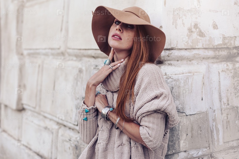 Модель в осеннем уютном свитере и ювелирных украшениях бохо