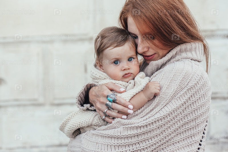 Мама и ребенок одеты в теплую зимнюю вязанную одежду