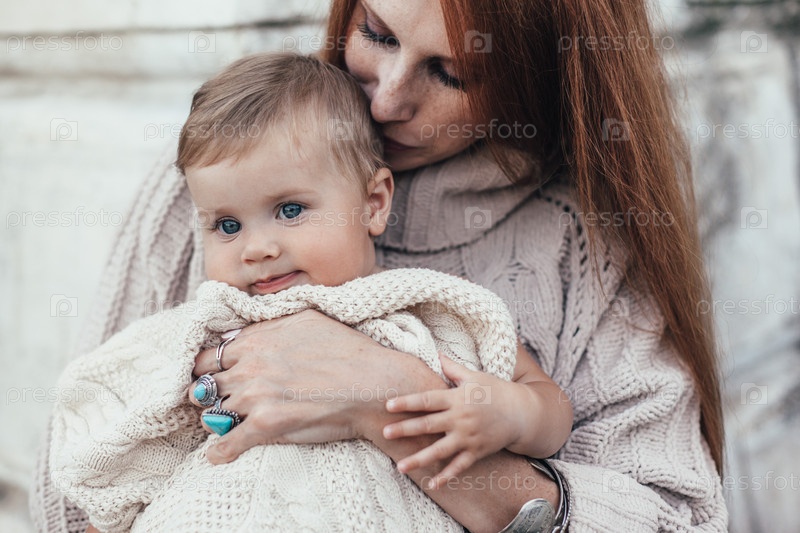 Мама и ребенок одеты в теплую зимнюю вязанную одежду