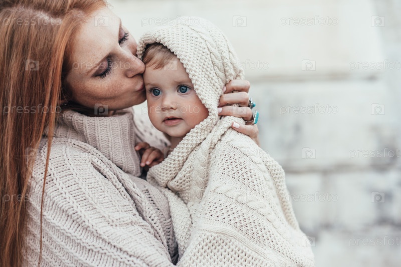 Мама и ребенок одеты в теплую зимнюю вязанную одежду