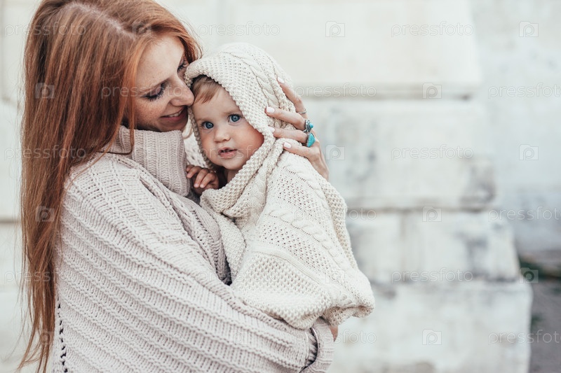 Мама и ребенок одеты в теплую зимнюю вязанную одежду