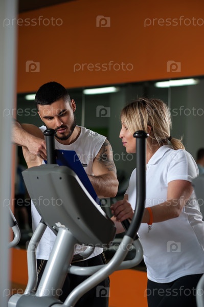 Женщина средних лет тренируется с тренером в тренажерном зале