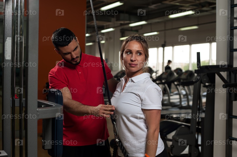 Молодой мужской тренер помогает женщине-клиенту в спортзале