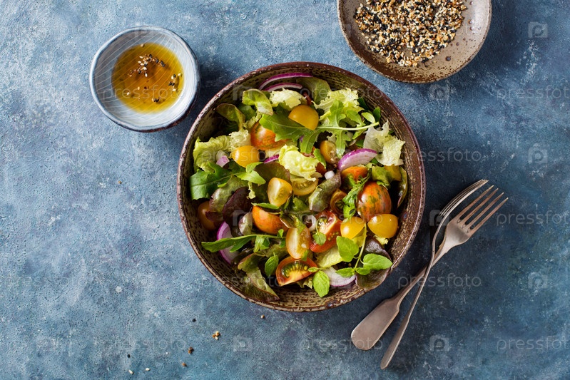 Домашний салат с цветными вишневыми помидорами, красным луком, свежим салатом, ругулой и оливковым маслом Концепция здорового питания