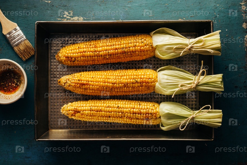 Свежие кукурузные хлопья на подносе для выпечки с маслом и специями