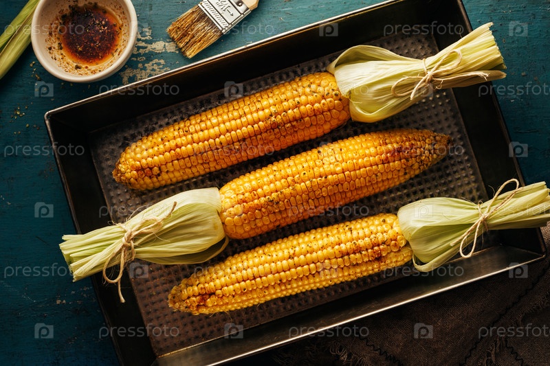 Сладкие кукурузные косточки на подносе для выпечки с маслом и специями