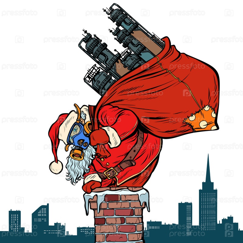 Труба экологического завода, маска для лица от грязного воздуха.Санта Клаус с подарком
