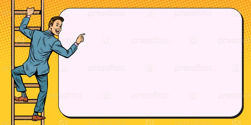 Бизнесмен поднимается по лестнице, мужчина указывает на копирование пространства
