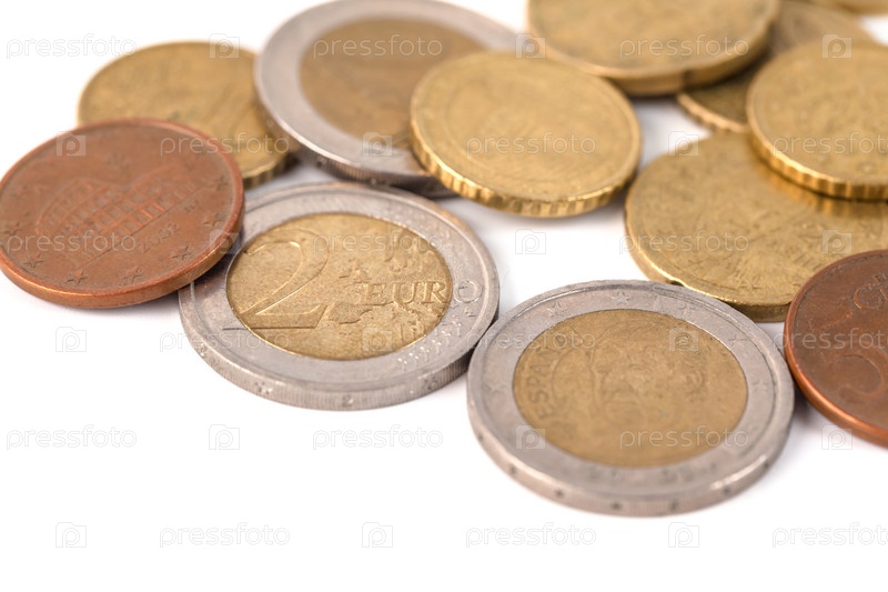 Монеты евро и центов, валюта Европейского рынка на белом фоне