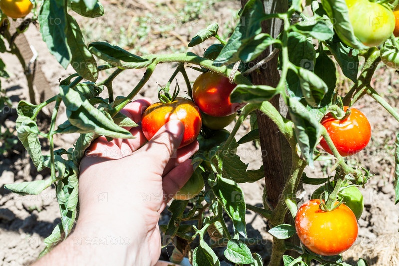 Рука собирает спелый красный помидор из куста