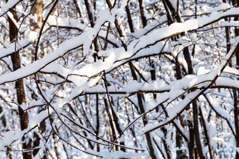 Заснеженные ветви деревьев в лесу зимой