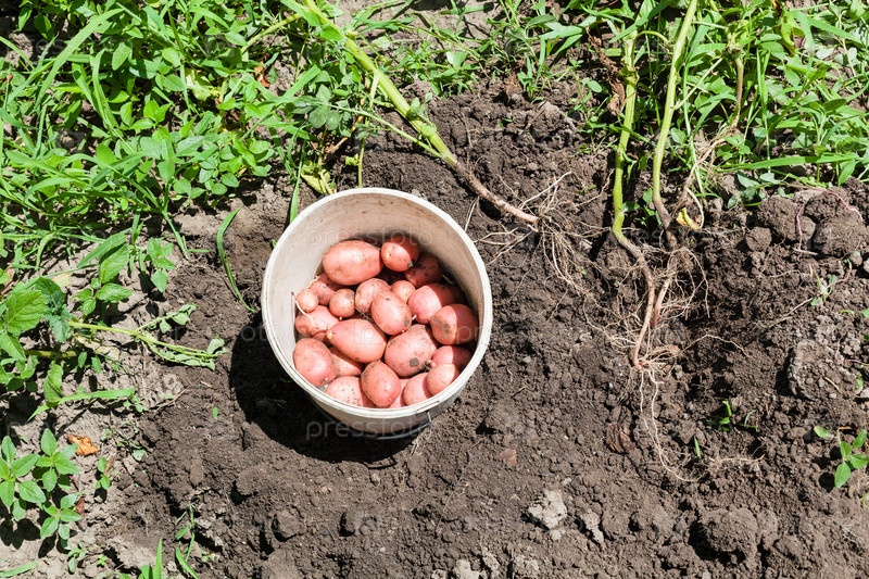 Вид сверху розовых картофелей в ведрах на выкопанной кровати