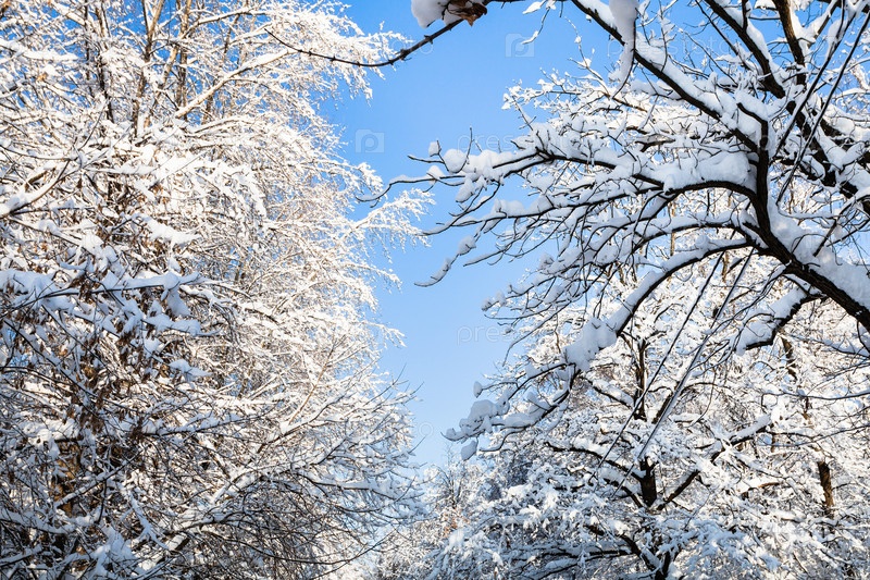 Нижний вид голубого неба между заснеженными деревьями