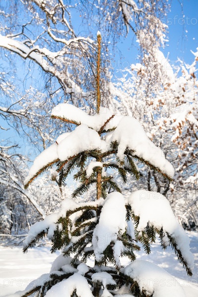Заснеженная ель в снежном городском парке