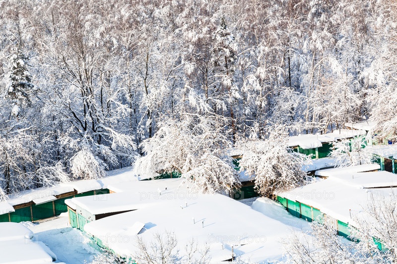 Сверху вид на заснеженные гаражи и снежный парк