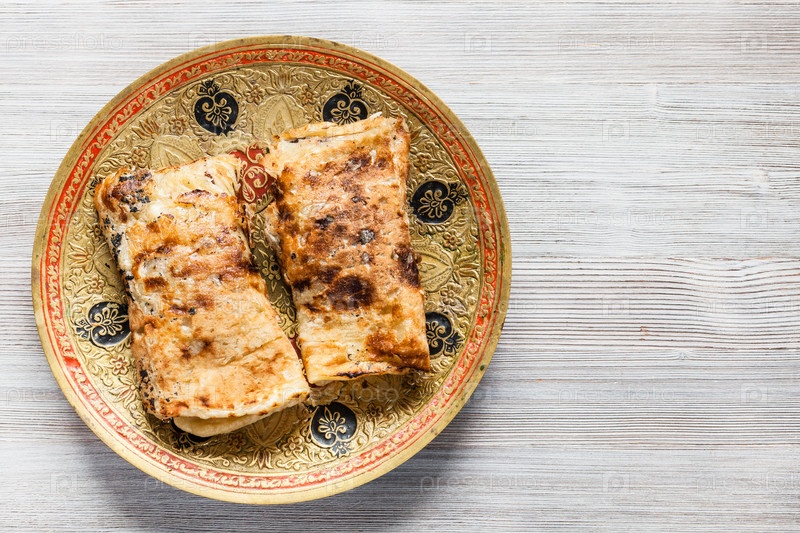 Наан-бутер на латунной тарелке на сером деревянном столе