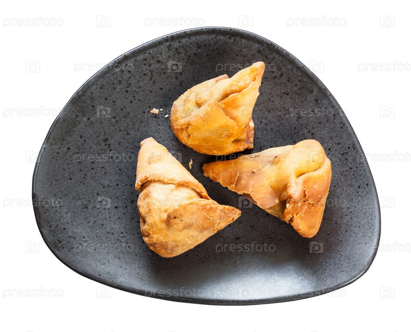 Овощная самоза жареной луковичной выпечкой на черной тарелке