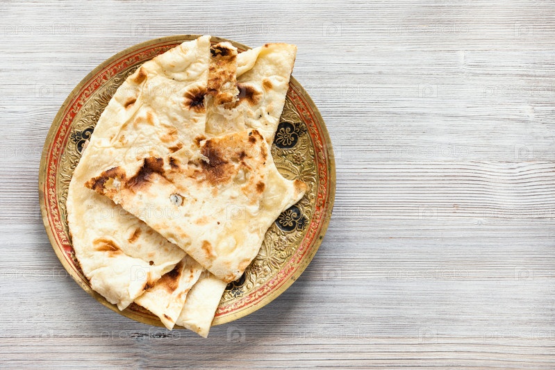 Нанановый плоский хлеб на тарелке на деревянном столе