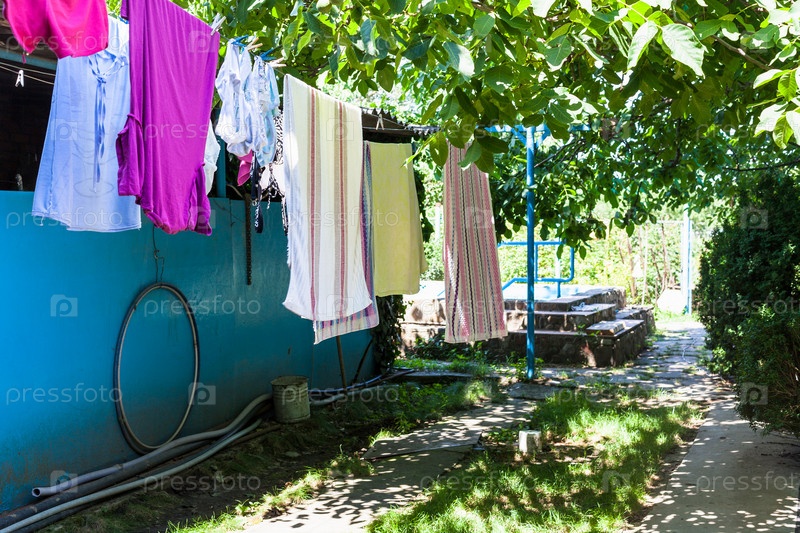 Одежда высыхает на веревках во дворе