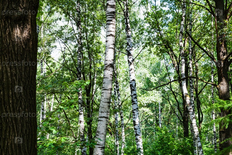 Береза и дуб в зеленом лесу в летний день