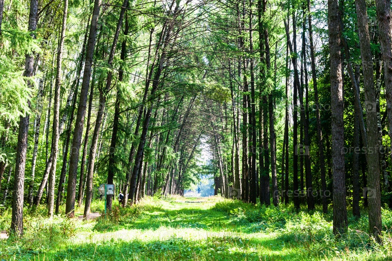 Аллея зеленых ларчей в парке в солнечный летний день
