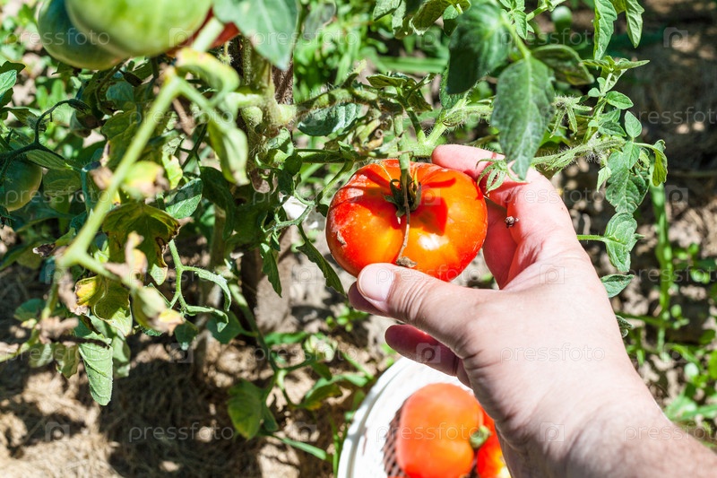 Рука подбирает спелый красный помидор из куста