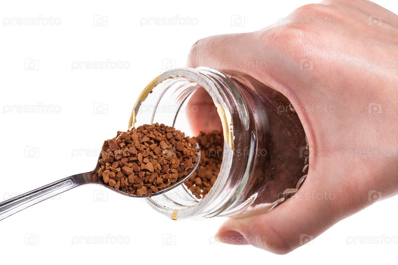 Стеклянная банка с растворимым кофе и ложкой изолирована