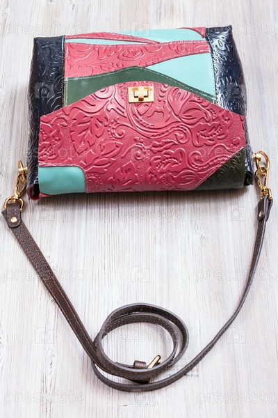 Пачворковая кожаная женская сумка на сером столе