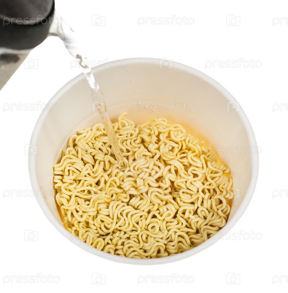Налейте воду в коробку с сушеными мгновенными лапшами