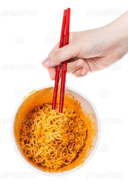 Рука держит красные палочки с мгновенными лапшами