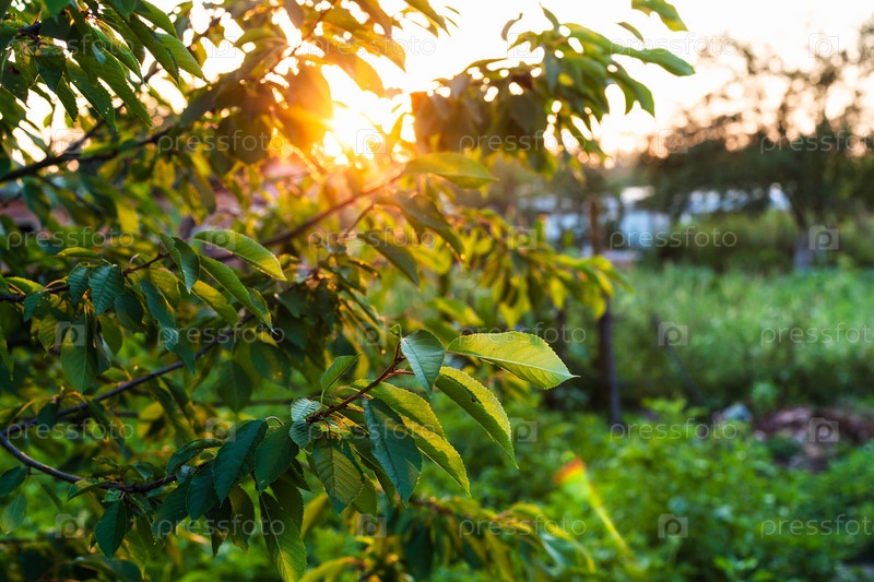Ветки деревьев, освещенные закатом солнца в саду