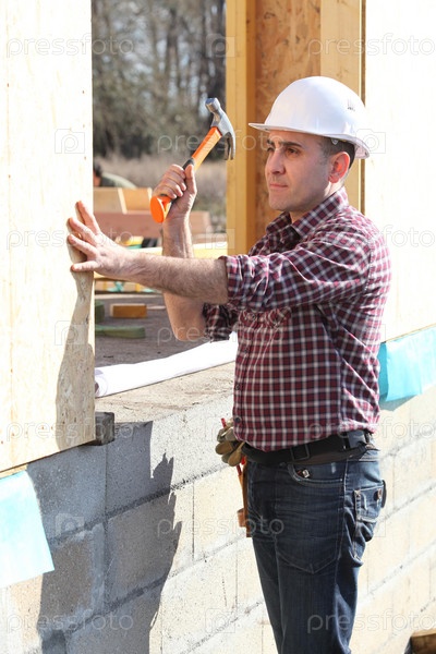 Строитель работает над домом
