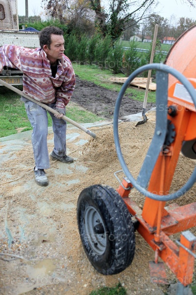 Рабочий кидает песок