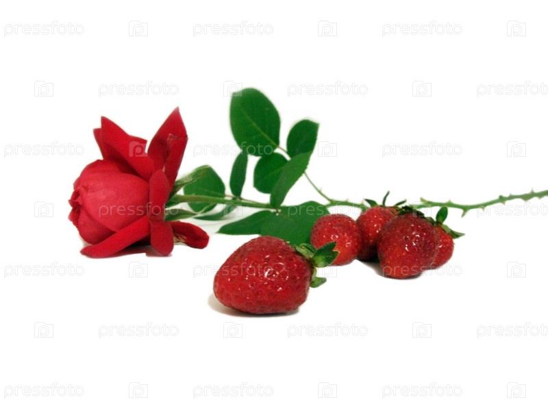 Алая роза и спелая клубника на белом фоне