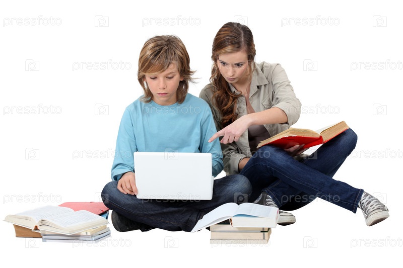 Двое детей с ноутбуком и книгами
