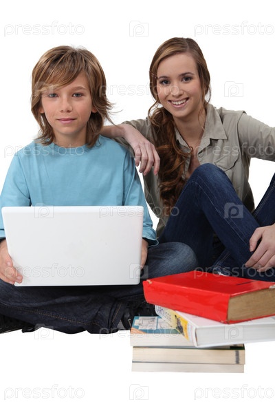 Двое детей с ноутбуком и книгами