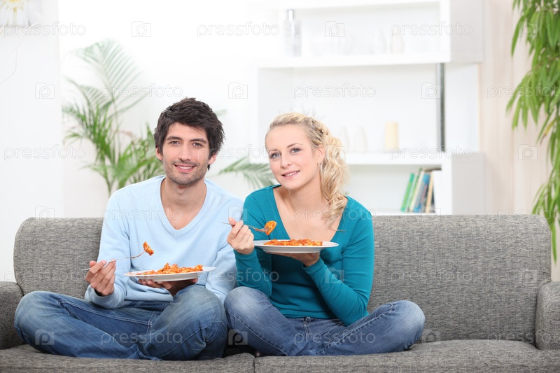 Пара обедает на диване