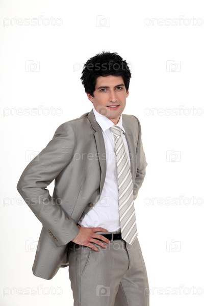 Портрет стильного бизнесмена с рукми на поясеии