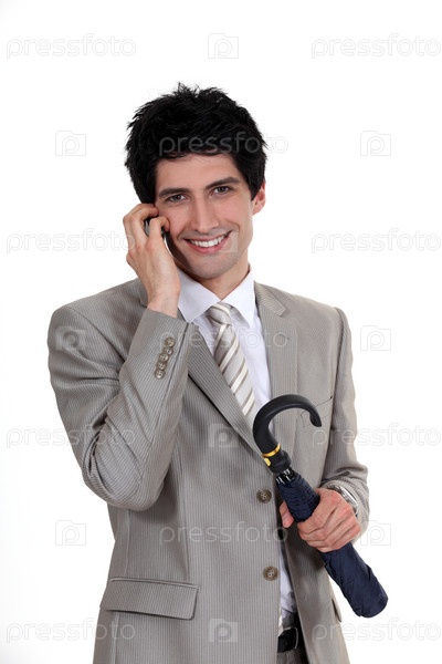 Бизнесмен с зонтом говорит по мобильному телефону