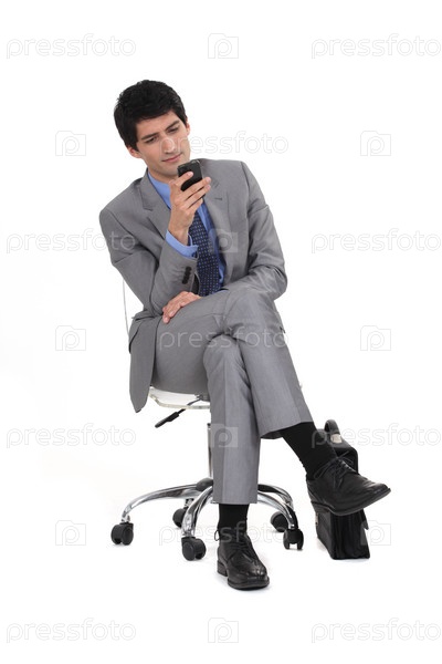 Молодой человек в костюме, отправляющий текстовое сообщение