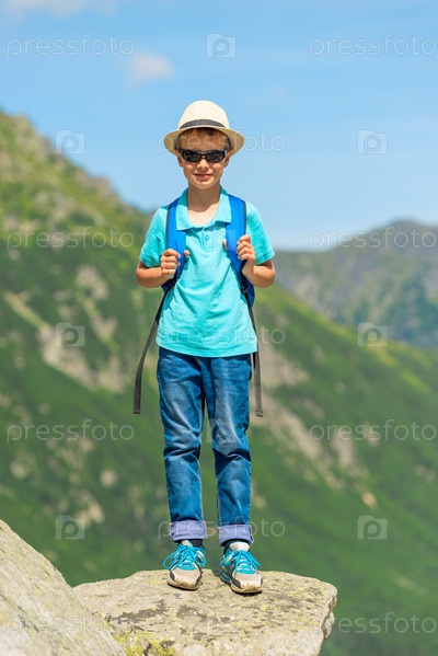 Портрет маленького путешественника с рюкзаком на фоне гор