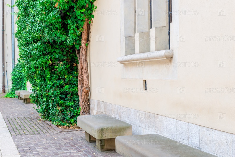 Скамейки против стены здания в городе