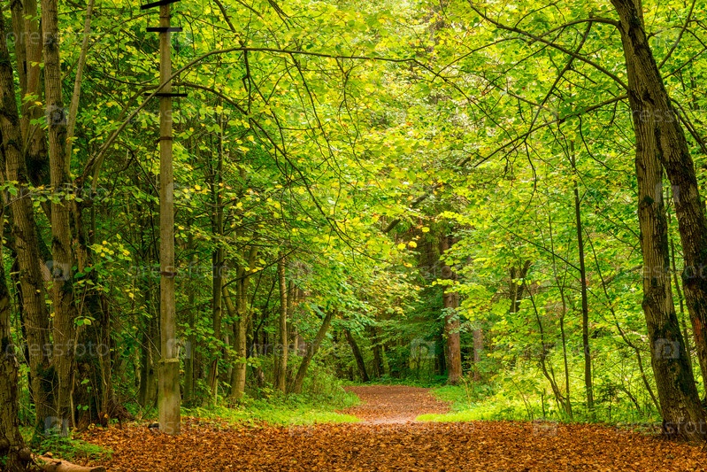 Павшие листья на тропинке осеннего леса, пейзаж в сентябре