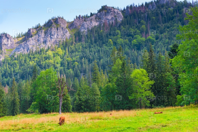 Коричневая корова пасется на лугу в Татринских горах