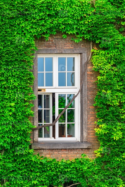 Близкий план густой лозы на кирпичной стене вокруг окна