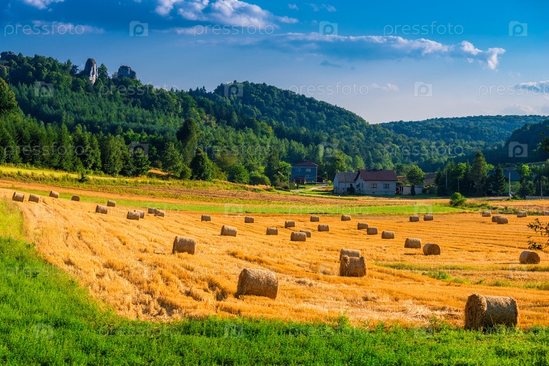 Кучи сена на желтом поле после сбора урожая, красивый пейзаж