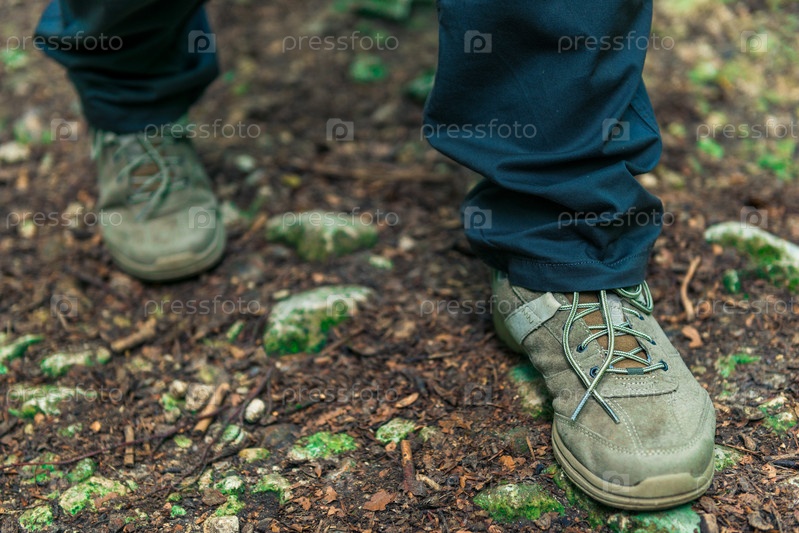 Ноги туриста в сапогах на тропе в лесу крупный план