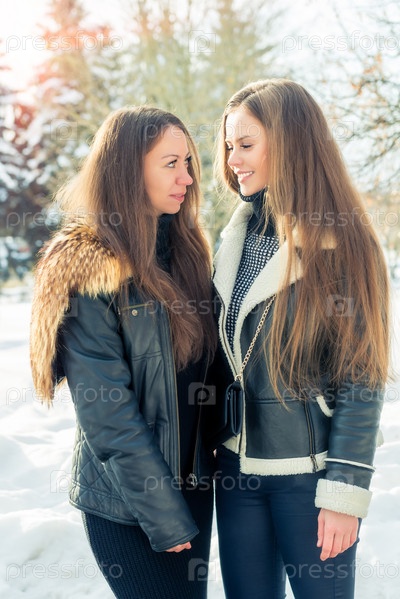 Подруги девушек зимой в природе, портрет в солнечный день